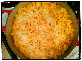 Now, turn off the heat and stir in the undercooked macaroni. Top it all off with some cheddar and parmesan cheese.
